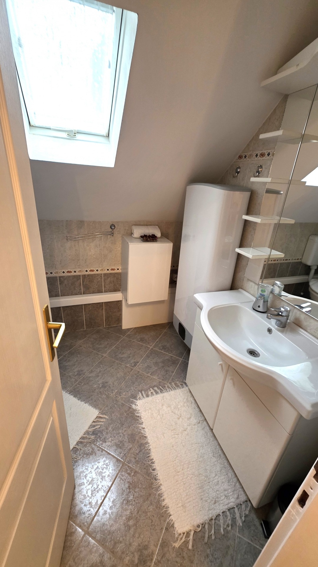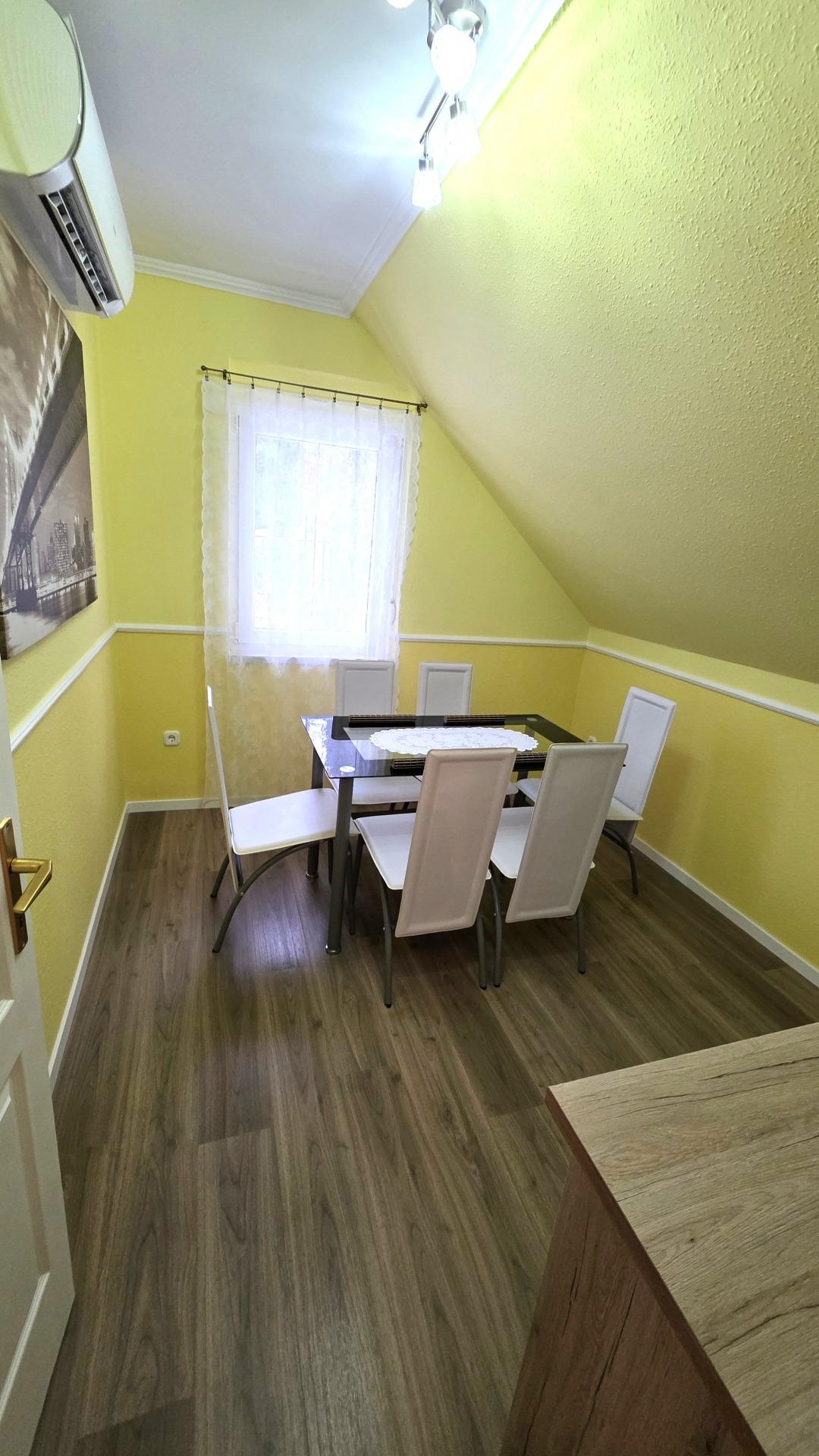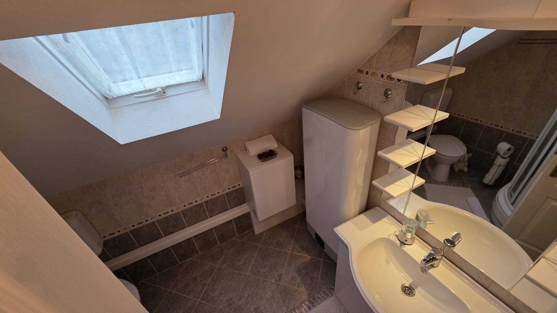 Zala vármegye, Zalakaros 140m2-es családi ház eladó. A közkedvelt zalai fürdőváros csendes utcájában található, a fürdő kényelmes sétával elérhető. A 2000-ben épült, majd felújított, korszerűsített ingatlan garázsszintjén két gépjárműbeálló, tárolók és illemhelyiség, a nagyméretű terasszal rendelkező fogadószinten nappali, konyha étkezővel, hálószoba, fürdőszoba illemhelyiség és közlekedő, míg a lépcsőházból megközelíthető tetőtérben további 3 szoba, konyha (mely szobává visszaalakítható) és közlekedő került kialakításra. A szigetelt családi ház melegéről hűtő/fűtő klíma (6db) gondoskodik. A ház áramellátását napelem rendszer biztosítja. A 700m2-es, parkosított telken gépjárműbeálló, kerti kiülő, szerszámtároló szolgálja az ott élők kényelmét. A tehermentes családi ház szálláshelyként is hasznosítható, erre a szükséges engedélyek, és visszajáró vendégkör is rendelkezésre állnak.