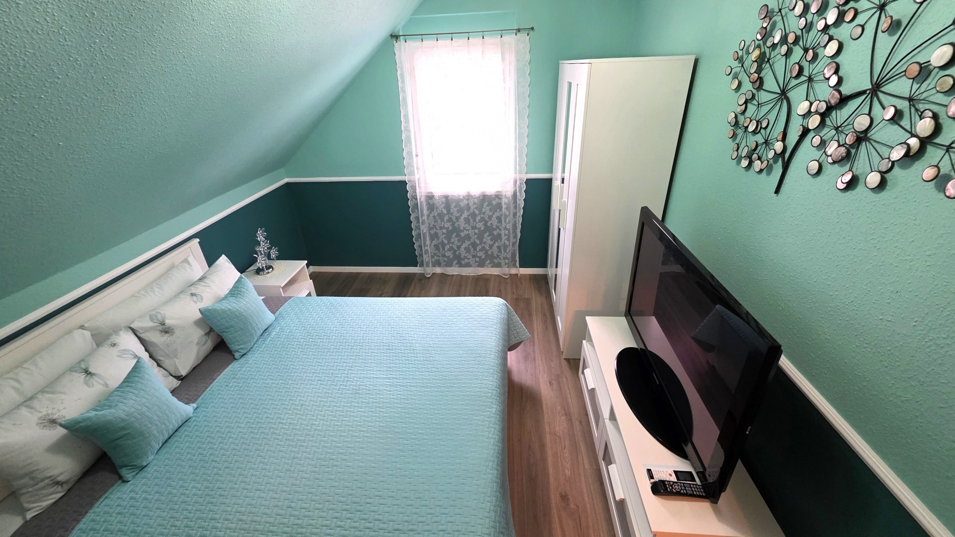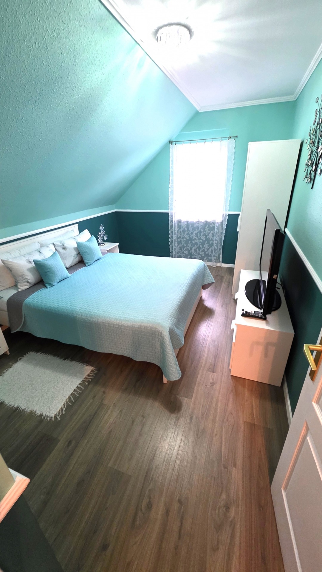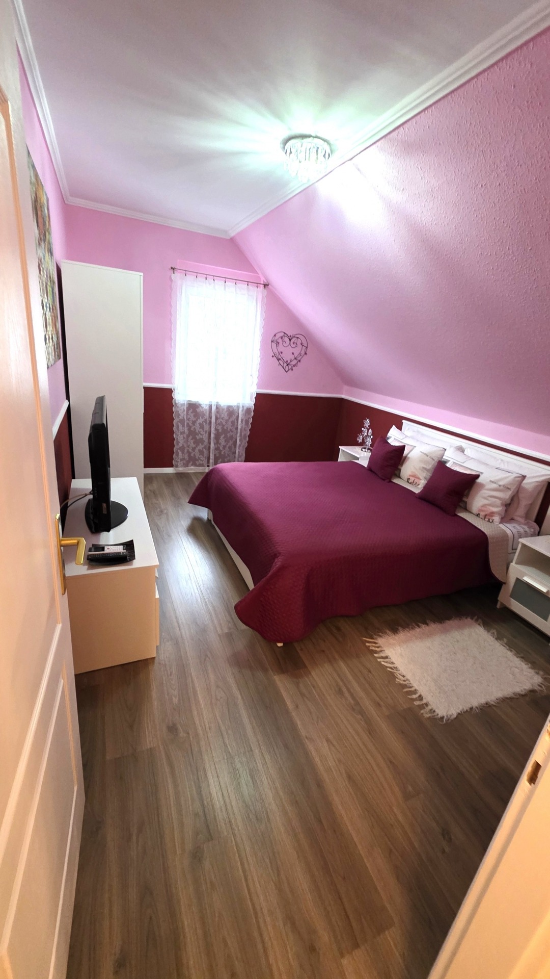 Zala vármegye, Zalakaros 140m2-es családi ház eladó. A közkedvelt zalai fürdőváros csendes utcájában található, a fürdő kényelmes sétával elérhető. A 2000-ben épült, majd felújított, korszerűsített ingatlan garázsszintjén két gépjárműbeálló, tárolók és illemhelyiség, a nagyméretű terasszal rendelkező fogadószinten nappali, konyha étkezővel, hálószoba, fürdőszoba illemhelyiség és közlekedő, míg a lépcsőházból megközelíthető tetőtérben további 3 szoba, konyha (mely szobává visszaalakítható) és közlekedő került kialakításra. A szigetelt családi ház melegéről hűtő/fűtő klíma (6db) gondoskodik. A ház áramellátását napelem rendszer biztosítja. A 700m2-es, parkosított telken gépjárműbeálló, kerti kiülő, szerszámtároló szolgálja az ott élők kényelmét. A tehermentes családi ház szálláshelyként is hasznosítható, erre a szükséges engedélyek, és visszajáró vendégkör is rendelkezésre állnak.